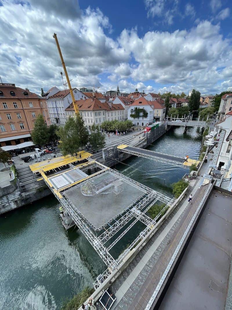 Nad Ljubljanico že stoji največji trampolin na svetu, ki bo v soboto gostil tekmo Gimnastične zveze Slovenije, šov Dunking Devils in prvi obračun svetovnih asov zračnih akrobacij na tako veliki ponjavi. Atrakcija, ki jo želita gostiti tudi Dubaj in Pariz, omogoča polete vsaj 14 metrov visoko. Obiskovalci bodo lahko brezplačno poskakovali v Woop! trampolinskem parku, z brega na breg prestolnice pa skočili tudi po trampolinskem mostu Akrobat.