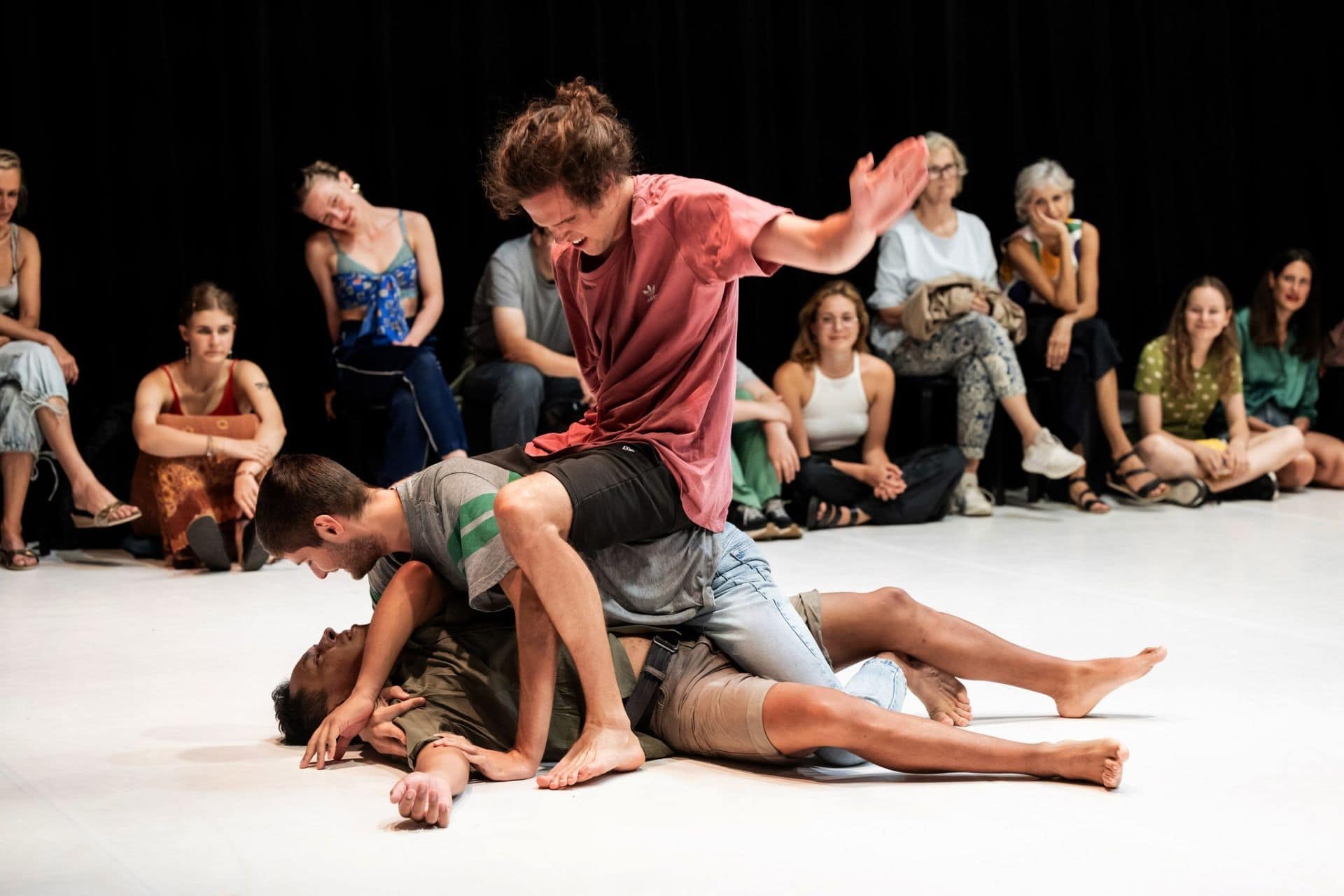 V predstavi se je dokaj nelagodno sledilo neprijetnemu nadlegovanju, ki poteka med akterji terceta, ko se eden na drugega lepijo, prilepijo, tudi sesajo kožo onega drugega ali pač zagrizejo, ko s silo zobje zapičijo v meso. Ko držiš nekoga za vrat ali mu pač slinasto pihaš za vrat, naslednje, kar sledi, je tepež, metanje ob tla, stopanje z vso težo po telesu drugega … In so kapljice potu letele po dvorani, ki so jo sede obkrožili gledalci. Oni pa žareli, se v predahu eden drugemu nasmihali, v presledkih objemali, tudi poljubljali na čelo, pa še rekreativno ali športno obletavali dvorano, torej nabirali kondicijo vse do ekstaze, ko se Daniel Victoria usmeri na dolgo neonsko cev/svetilko, ki je bila del scene, in se s sijočo lučjo postavi na sredino dvorane, nato jo skupaj s težkim okvirjem in žicami zaluča na rame, z rokami pa se obesi nanjo; končna prispodoba pa mučenik, ki križa samega sebe. Trije junaki so bili prepoteni, zagreti, zadihani, tako da je ob tem raziskovalnem luščenju moške osebnosti sledilo nujno slačenje do nagega; gledišče pa ostalo dokaj podhlajeno. Predstavi se sledi kot raziskovalni nalogi, ki se na sceni gradi in raziskuje, kar je gotovo zanimivo in zahtevno za raziskovalce/ustvarjalce, morda tudi za opazovalce, ki lahko (in če) pridobijo še kak uvid. Sicer je koncept zanimiv, ko tokrat neposredno in poglobljeno ravno moški skušajo razgaliti moški rod, pač zarezati v kalup zglednega podjetnika ali pač resnega in odraslega ‘masculine’, tako kot se spodobi, in je teoretično ter družbeno konstruirano. Ob konceptu se (po žensko) sprašuješ, če je to ekstatična moškost, da se najprej mlatiš, potem pa športno trepljaš. Je torej ekstatična moškost ena sama nenehna borba za prestiž, za razkazovanje lastne moči? Povprašala sem znanca (Gorenjca), kaj on meni o pretepu, je morda moška zasvojenost, zanosnost. V trenutku se je odzval s pozitivnim mnenjem, kajti od malega so se med seboj ‘garbali’, tudi pozneje za prazen nič ali zavoljo potrebe, kljub temu pa bili prijatelji. V pogovoru z Danielom Victorio sem le dobila nekaj razsvetljenja. Njihova naloga je bila, da se fizično spravijo eden na drugega, če pa nastopi bolečina, potem se da znak za konec, težave pa uravnajo v prijateljskem objemu, in seveda če do tega pride, tudi se slečejo do nagega. Zanimalo ga je, kaj menim o prispodobi dolge neonske luči, odgovorila sem, da meni predstavlja težo bremena, torej bolečino, ko se s predmetom obteži lastno hrbtišče; čeprav po svoji obliki in v sferah domišljije bi lahko bila še kaj možatega, sicer pa so moči fizično močnejšega spola vidne in prisotne na vseh področjih življenja, da ne omenjam bojev in vojn; saj živimo v času patriarhata.