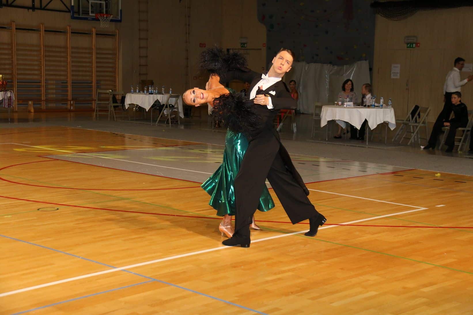 Maša Kastelic je imela prekrasno smaragdno zeleno obleko za standard in elegantno črno za latin oblikovalca in sponzorja DF Design. Prav nič ‘nakičena’ je z Akimom Pekunovim obranila naslov državne prvakinje. Feniksovca le tega trdno držita že od leta 2019. V članski kategoriji je plesalo pet parov.