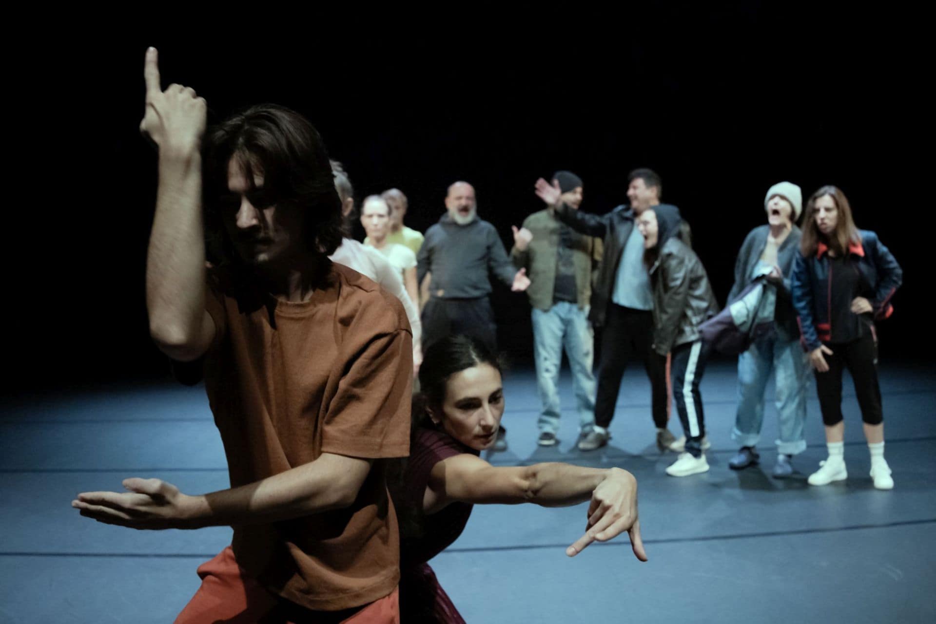 Skupina plesalcev med pandemijo v zgodnji pomladi pripravlja umetniški dogodek na trgu v srednjevelikem mestu. Med vajo plesalcev se v njihovi bližini začnejo zbirati brezdomci. Plesalci plešejo, brezdomci, ki jih je vedno več, pa z zanimanjem spremljajo dogajanje in komentirajo. Komentiranje se razvije v humorne opazke, iz humornih opazk nastanejo žaljive pripombe, govorjenje postano glasno in preraste v kričanje, glasno zmerjanje prerašča v grožnje in približevanje plesalcem.