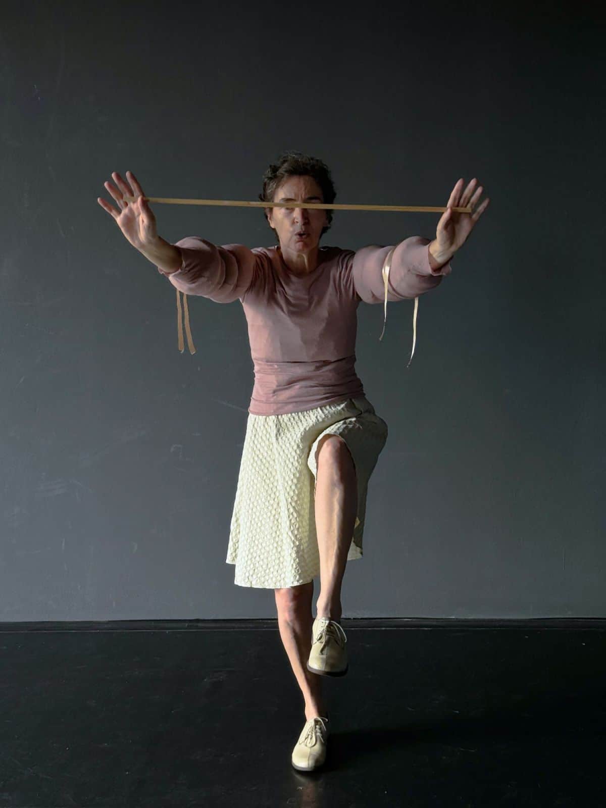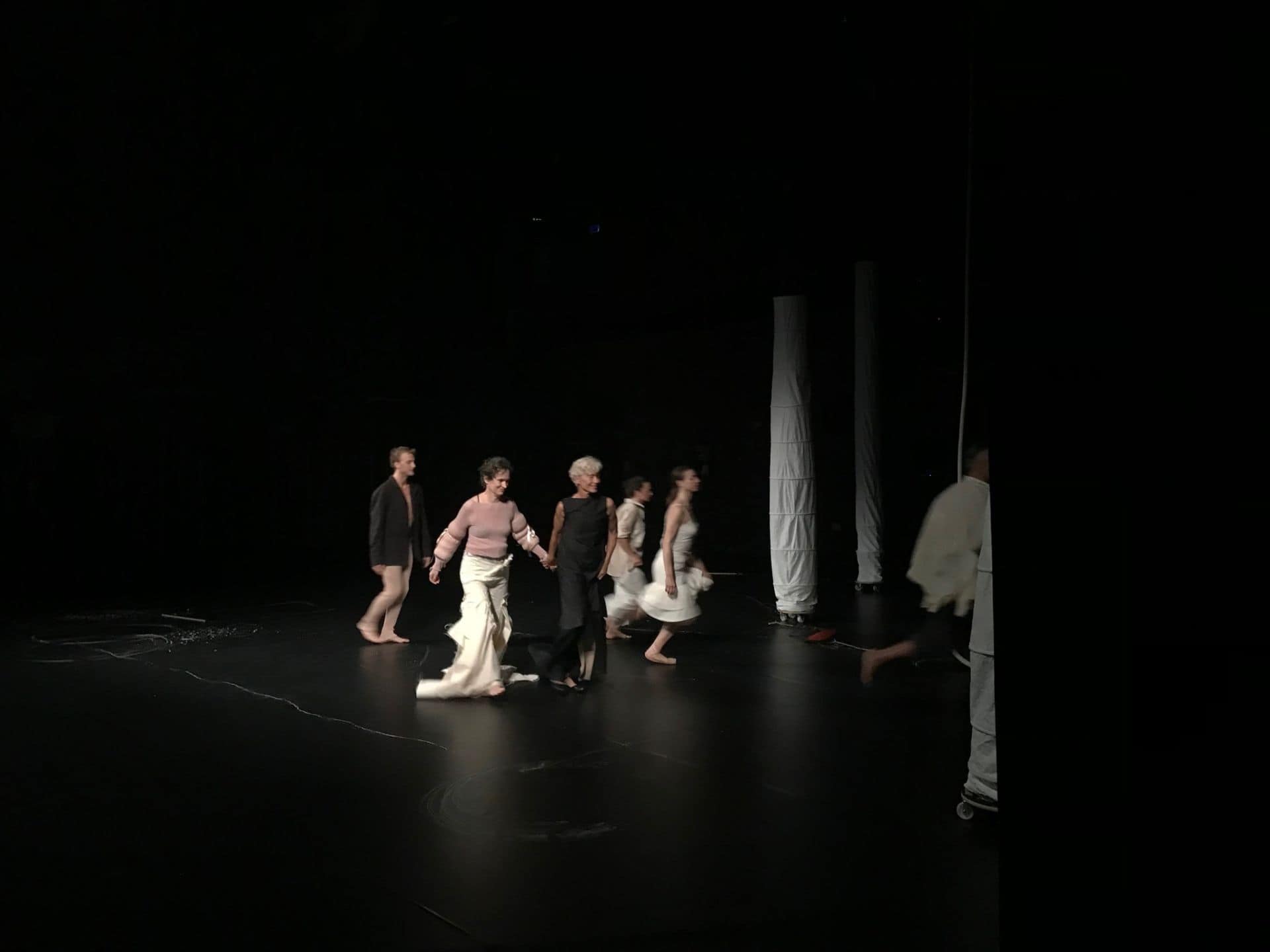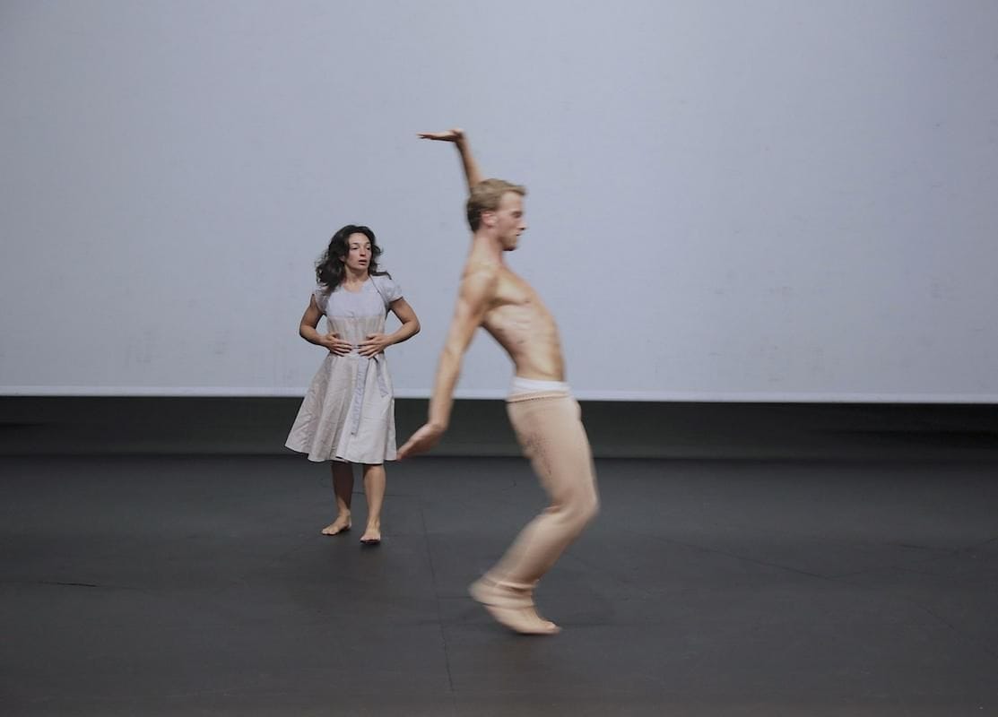 Proti koncu v prostor vstopi še starejši par, Mateja Rebolj in Branko Potočan, in si poišče svoj želeni kotiček na svojem koncu parka. Ona se napoti proti središču vrtnega dogajanja, ko v svojem prefinjenem gibanju izrisuje nevidno pot po središču vrta medtem, ko se Branko osredotoči na desni kvadrant vrta, kjer visi dolga debela vrv, tudi z njo prične krožiti tik ob tleh. Po nekaj krogih in z oprto Matejo na ramenih, ki ima belo kredo med nožnimi prsti, zarišeta bela krožišča po tleh; tako se misel o izrisanih plesnih poteh ter zračnih krožnicah končno le materializira na odrski sceni vrta.