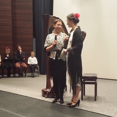 V duhu španske kulture se je ta lepo pripravljen večer tudi začel, podprt s strani veleposlaništva Kraljevine Španije in počaščen z obiskom njihove veleposlanice in pesnice Anunciada Fernández de Cordova, ki je navzoče pozdravila, tudi sicer jo večkrat zasledimo na naši kulturni sceni. Na začetku in kot uvod v svet glasbe flamenka so na harfi zaigrali učenci profesorice Anje Gobec, Konservatorij za glasbo in balet Ljubljana. Velika harfa na sredi odra je kar vabila, kulturno dogajanje pa odprl Jure, ki je s svojimi otroškimi prsti spretno gladil in zategoval strune harfe, sledila je Julija s skladbo Ole, nato pa še Taja z zahtevnejšo kompozicijo Dos gitaros / Dve kitari, ko strune harfe spevno zavejejo melodiko kitar. Pogovor z glavno junakinjo tega večera, simpatično žensko toplih oči, pred samim predvajanjem dokumentarca o njenem umetniškem in terapevtskem poslanstvu, je zaključila mlada virtuozinja Stela, kot bi s prsti plesala flamenko in ne le igrala na harfi, s skladbo Barok flamenko pa pričarala temperament španskega baroka. …