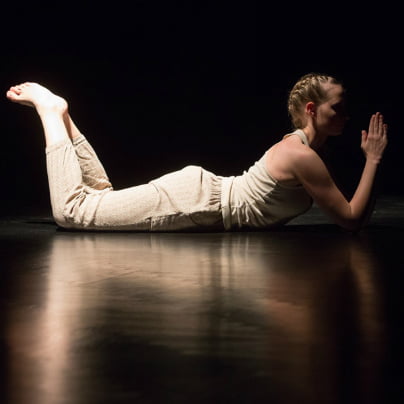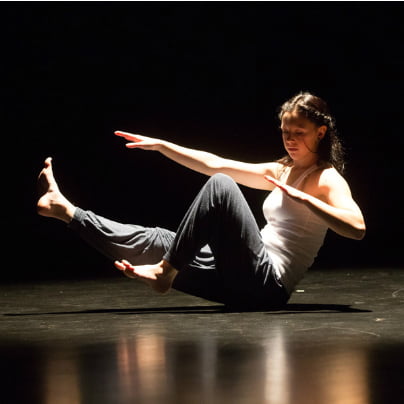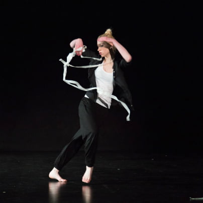 Karin Vrtar v plesnem nastavku Dotik prostora skuša razmišljati o prostoru in gibanju, kako prostor vpliva na gibanje in kako telo oziroma njeno gibanje lahko oblikuje prostor, na koncu pa veselo ugotovi, da je nastal v telesu premik, ki je označil prostor. … Mojca Lukan …
