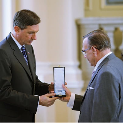 Miha Verbič prejema odlikovanje iz rok predsednika države Boruta Pahorja.
