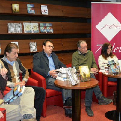 Na predstavitvi knjižnih novosti v knjigarni Konzorcij (z leve) Emil Filipčič, Slavo Šerc, Aleš Debeljak in Katarina Majerhold.