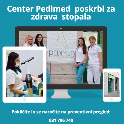 Čas zimskih obuval je za nami. Še malo pa bomo že planirali daljše počitnice. Da bodo vaše noge zdrave in lepe, brez nadležnih glivic, bolečih vraščenih nohtov, kurjih očes in podobnih trdovratnih nadlog, se oglasite v Centru Pedimed na Peričevi 21 v Ljubljani na pregled. Center Pedimed vas pričakuje.
