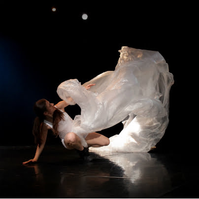 Prva slika je likovno statična, je tudi zanimiva likovna instalacija postavljenega ženskega telesa, ko njeni dolgi lasje zakrivajo njeno obličje. Ona stoji na koncu diagonale zasenčenega prostora in od pasu pa do drugega konca diagonale širi belo prosojno vlečko. Ženska, tako zajeta v prostorski sliki statike, ni kip, je živ organizem, ki čuti in diha ter širi svoja notranja občutja v prostor, kar se tudi zaznava na strani gledišča. Zven gonga v prostor vnese dodatne vibracije (zvočna podoba Jure Vlahović). Ko pa začne teči ura in se sliši urino tiktakanje, se roke rahlo širijo, naslednji likovni vtis je božanska vizija. Roke se ne zaustavijo, ampak se v prefinjenih gibih še naprej počasi premikajo in začnejo z nabiranjem nekaj metrske vlečke, jo tudi neobičajno spravijo v formo krila, ki v spominu izbrska čase preteklih stoletij. … (Foto: Sunčan Stone)