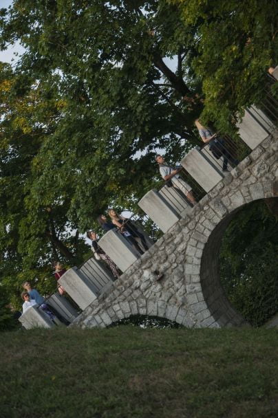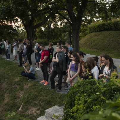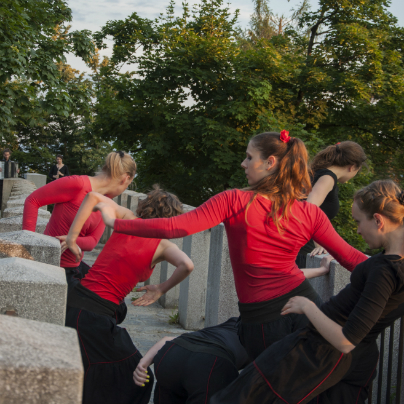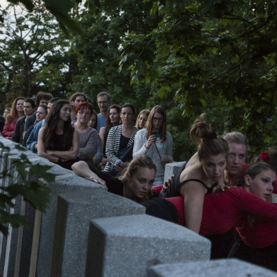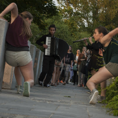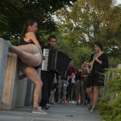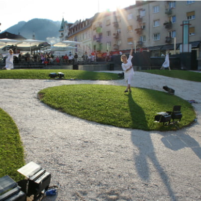 Performans je bil zanimiv, na travniku pri anteni so se iz publike z gibanjem in plesom izluščile plesalke kot nekakšne žive priče današnjega vsakodnevnega dogajanja v tem prostoru, sledilo je njihovo skupno plesno udejstvovanje na poti, ki pelje po razglednih arkadah, sem so jih zvabili  glasbeniki, po stopnicah navzdol sta jih popeljali dve plesalki, ob drevesnem deblu jih je pričakala gozdna vila, skupina plesalk pa nadaljevala s plesom spodaj, na terasi s klopcami, od kjer so se povzpele do gledalcev in nato zbežale po ozkem hodniku na gozdno jaso.