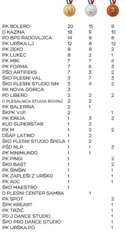 Videli smo boljše in slabše plesne umetnine in nekaj vrhunskih, ob katerih cela dvorana obnemi ali nori. Izkazalo se je, da državno prvenstvo kljub celoletnemu seštevanju točk in vseh pokalnih turnirjev ne izgublja pomena, saj smo videli številne nove koreografije, v katerih se plesalci še dodatno bolj potrudijo in poskrbijo za res dodelan videz. Kljub motu letošnjega državnega prvenstva o povezovanju plesalcev, koreografov in plesnih klubov vladata velika konkurenca in tekmovalnost, saj med seboj tekmujejo resnično najboljši, ki v svetu pobirajo številne naslove evropskih in svetovnih prvakov. Vsaka uvrstitev med prve tri je tako težko prigarana in nadvse pomembna, saj omogoča plesalcem udeležbo na mednarodnih tekmovanjih. Izrazito se tudi vidi, katera plesna zvrst je paradna v določenem plesnem klubu, in le nekaj od njih je med najboljšimi v več plesnih zvrsteh hkrati med modernimi tekmovalnimi plesi. Po statistiki medalj so letos največ zlatih in srebrnih, hkrati pa tudi največ medalj, kar 43, prejeli plesalci Plesnega kluba Bolero, takoj za njimi so plesalci Plesnega društva Kazina s 37 medaljami, nato jim sledi plesno društvo BPS Radovljica s 30 medaljami, izstopal pa je tudi Plesni klub Urška Ljubljana z največ bronastimi in s skupno 32 medaljami. … število osvojenih medalj … (foto: Ažman)