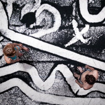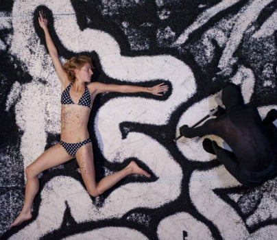 Zatemnitev Philippea Saire se zgodi v boksu, v črnem bazenu, spremlja pa od zgoraj, ko se zre v osvetljeno talno belino, kjer so postavljene tri človeške postave, dve moški in ženska. Ti nepremično ležijo na vzorčastih črno-belih brisačah, odeti v črno-bele kostumske poslikave kopalk, torej se sončijo v obilju svetlobe in so zatopljeni v svoj mirni svet. Ta veliki štirikotni boks je postavljen na oder Velike dvorane Španskih borcev, ki ga kar redno in scensko oblikovano uporabljajo za solistične uprizoritve, le da tokrat ni bilo stolov postavljenih naokrog, ampak so gledalci stali eden ob drugem na robu stranic in nad črno 2,5 metra globoko konstrukcijo ter gledali navzdol v ta zračni akvarij svetlobe in osebnega udobja. …