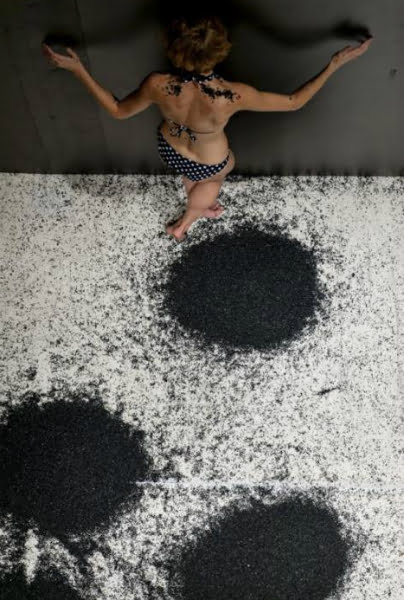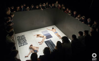 Črno-bela poslikava prostora s črnim prahom predstave Zatemnitev, ki se ob gibanju razprši po ploskvi zajetih tal, me glede na talne orise črnih gumijastih zrnc prahu in po načinu talnega vzorčenja spominja na predstavo, ki sem ji sledila letošnjega julija na festivalu Kilowatt v Sansepolcru v Italiji. Takrat sta plesalca Elisabetta Lauro in Cesar Augusto Cuenca Torres v svojem štiriročnem vklenjenem objemu in v plesu korakov ter figurativnih gibalnih oblik trosila in brisala večji kup črne gmote po belih tleh odra ter ustvarjala niz belo-črnih trenutnih in minljivih likovnih poslikav, linij, krogov in poti, ki so se kar hitro spreminjali. Medtem ko velika črna škatla kot predmet zamejitve prikliče neposredno v spomin koreografa in plesalca Mitjo Obeda in njegov avtorski solo The box, kjer išče lastne presežke in razmejitve v svojem telesu ter na plesni sceni. Verjetnost podobnih izzivov in solucij je na uprizoritveni sceni našega časa gotovo pogosta, ko živimo v globalnem svetu in v tekočih pretokih informatike, ko umetniki očitno stojijo pred podobnimi izzivi in spoznanji, ki jih potem v svojem ustvarjalnem navdihu odsevajo in pojmujejo v lastnih stvaritvah ter je ujetost v današnji življenjski strukturi že kar aktualna tematika.