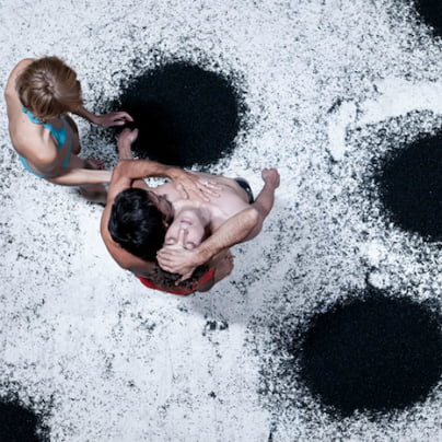 Gibi in raztegi treh akterjev se počasi in lenobno prebujajo, so tudi natančno začrtani premiki, ki se v sodobni gibalni substanci pretakajoče nadgradijo in se združujejo ter razdružujejo v geometričnih telesnih poslikavah. Ko pa njihovi premiki vse bolj in vse pogosteje oscilirajo, se iz neba reflektorjev zgodi nenadni štrbunk črne gmote, ki se nenapovedano tudi kar naprej repetira, vse dokler ne obloži belih tal. Število tri v postavitvi medsebojnih odnosov, torej trojka oseb že po pravilu izpostavlja trikotnik nelagodja in ostrine kotnih oblik, ki pa dobijo nenadne pospeške v nemirnih in nenapovedanih situacijah. Tako se zgodi, da ta črna masa s svojim nasilnim vdorom v prostor povzdigne atmosfersko raven vznemirjanja in raziskovanja, moški duet pa kar pade v oprijemljivo borbeno igro, medtem ko ona nežno otipava črni prah, gumijaste kroglice, ki spominjajo na prah oglja, in sanjavo osvaja svoj zajeti prostor. Telesno gnetenje in valjanje obeh akterjev po tleh, posutih s črno maso, izpisuje belo-črne konture, svetloba pa že niansira črnosive odtenke in dodatno pripomore k zgoščenosti atmosfere tam doli. Moška neopazno izgineta ob črni steni, ženska pa se znova udobno uleže, tokrat na ploskev črnega prahu. …