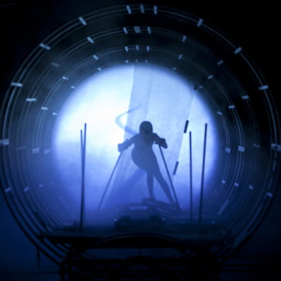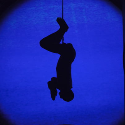 Scena je premična in vpeta v velike kroge, ki se premikajo po tračnicah, uprizoritveni prostor pa pridobi voluminozno podobo tunela, kar ob  svetlobnem oblikovanju pripomore k poglabljanju vizualnih globin, ko prihodi in odhodi pridobijo navidezne razdalje ter časovne zamike. Ilustrativno scensko zgradbo dopolnjujejo še zgodovinski videoposnetki, družinski foto albumi in jo polnijo slikovite koreografske oblike Branka Potočana, kar sceni doda nove neizmerljive dimenzije, ko silhuete visijo na plezalnih vrveh ter iluzorno odsevajo stanja nastalih trenutkov. Priča smo novim gledališkim senzacijam in scenskim manipulacijam, ki živo in vizualno zapolnijo dramski prostor (scenografija Tomaž Štrucl, Sandi Mikluž za estrihe in omete; oblikovanje svetlobe tudi Tomaž  Štrucl in David Cvelbar). Pograjc je ob neki priložnosti komentiral, da pri nas ni pravega posluha za nova scenska raziskovanja in so tovrstne spodbude kar finančno zamejene, no, s Štruclom, kot je možno videti, kar domiselno in inovativno ubirata pota svojih novodobnih scenskih vizij. Videmškova dramatizacija življenjske zgodbe o Roku Petroviču, o človeku svobodnega duha, tudi smučarju, znanstveniku in boemu, kot je sam sebe poimenoval, teče gladko in neposredno v jeziku izkušenega novinarja, ki mu prelomni čas našega državnega socializma ni neznanka in ki ni bil nič manj  prepreden z elementi marketinškega dobičkarstva, pa čeprav v sferah ideološkega prestiža in športnih presežkov. Zgodba o Roku poseže tudi v čas štiriletnega otroka, ki se navdušuje nad smučanjem in ga mama Zdenka postavi na prve smučke, on pa jo pozneje vpelje v svoj svet joge, ki popelje do ashrama, in vpelje v tehnike meditacij. Ko pa je mladi športnik Rok dodobra zagrizel v materijo smučarske športne discipline, ga v svoje trenerske roke prevzame še oče Krešo, ki ga je utrjeval ter spodbujal v njegovih tekmovalnih vnemah, tudi disciplinirano vodil do izrednih rezultatov, čeprav je Rok že kot mladostnik vse bolj hlastal po svobodi duha in neomejenosti, kar je tudi našel v potapljanju na vdih in bil na novo zasvojen z novimi spoznanji tam pod vodo.