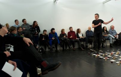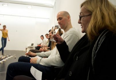 Ob vhodu v razstavni prostor je obiskovalec moral prevzeti čašo belega vina, dobil pa tudi napotke, kako se ta lahko znova in znova polni. Na  tleh scene je bilo že razvrščenih sto kozarcev po deset v vsaki vrsti, delno napolnjenih z rdečilom in rumenilom vinske barve, ob njih pa slastne slaščice, ki jih je Anita v eku predstave mečkala pod stopali (ob žalostnih vzdihih gledalcev), se tudi postavljala v baletne visoko leteče poze. Najprej pa je nazdravila sebi, gledalcem pa vsem skupaj in njemu, poetu Francetu Prešernu. Nato je sledilo klicanje številk v poljščini in branje zdravic v slovenščini, ki so jih gledalci dobili napisane na listkih. Kar spontano in v sproščenem zabavnem vzdušju je potekalo vključevanje gledalcev v performans, kar – kot vemo – le stežka poteka na slovenski sceni. Nazdravljalo se je jeziku, tudi govejem v solati z bučnim oljem, pa jeziku za zobmi, jeziku ulic, na glasbeni vizualni in plesni jezik, kjer se ne opleta z jezikom, tudi filozofskim stavkom in slovničnim zvezam, ko se je štelo v poljščini in skušalo razumeti ter slediti, ko bi se skoraj zamenjalo število 39 z 79 … Performerka se je ob vseh napetostih in vročicah nazdravljanja hladila z vsebino kozarcev, tudi tekočino akrobatsko zlivala po telesu, na koncu je morala še sleči in ožeti svojo oblačilno mokroto … Ko se je prispelo do števila 70 pa vse do 79, je gibčna Anita navila glasbo na ves glas, kajti nizale so se vse možne uvožene in udomačene kletvice (moje število je bilo 79), seveda se je vseh deset od 70 do 80 sila potrudilo in je jasno ter glasno preglasilo glasbo.