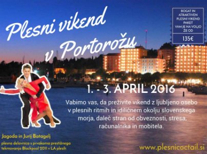 Prve dni aprila, od 1. do 4., se bo v Portorožu ponovno plesalo, saj organizator Plesni coctail znova pripravlja atraktiven plesni vikend, namenjen ljubiteljem družabnega plesa. Njihov slogan, ki vabi udeležence se glasi: "Vabimo vas, da preživite vikend z ljubljeno osebo v plesnih ritmih in idiličnem okolju slovenskega morja; daleč stran od službenih obveznosti, stresa, računalnika in mobitela". …