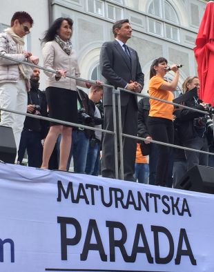 Seveda pa to ni edina črna pika letošnje parade. Prokofjev je namreč za udeležbo na paradi zahteval plačilo. In sicer od tistih maturantov, ki niso prek njega organizirali maturantskega plesa. No, v zagovor sicer pravi, da ni zahteval plačila od maturantov, ampak od plesnih šol, ki so maturante zavajale z obljubami, da bodo lahko nastopili na Maturantski paradi. Seveda gre tu za stare zamere, ki sežejo še v čas Tomaža Ambroža, ko je Boris Prokofjev kot družabnik v Plesni šoli Bolero organiziral plese za Zorana Kljuna, nato pa prestopil v Plesno šolo Urška in "odnesel" k Ambrožu ves tako imenovani "know how" in seznam srednjih šol. Nato se je na pobudo Rudija Kocbeka, ki je eden od organizatorjev maturantskih plesov na Štajerskem, Plesna zveza Slovenije odločila, da sama organizira Maturantsko parado in izrine Tomaža Ambroža, če ne popusti njihovim pogojem, kar bi pomenilo, da vse prepusti Plesni zvezi Slovenije. Ker Ambrož tega ni storil, imamo vsako leto dve vzporedni Maturantski paradi.Boris pa menda grozi, da bo tožil vse plesne šole, ki so v medije lansirale netočne informacije.Lekako bokomentiral odločitev maturantov in maturantk Srednje šole za oblikovanje in fotografijo, ki so se odločili zaplesati četvorko kar sami in se niso priključili ne Plesni zvezi ne Urški Pro. Njihova mentorica je bila namreč Azra Selimanovič, ki pa se v vojno maturantov ni želela vmešavati. Smelo. Azra namreč organizira teden državnih prvenstev konec junija skupaj s Plesno zvezo Slovenije. Mateja Hočevar Prokofjev (desno) s predsednikom države Borutom Pahorjem in njegovo partnerko Tanjo Pečar. Razplet Urške še ni končan. V juniju se bodo na dražbi prodajali tudi prostori na Štihovi 7 v Ljubljani, kjer zdaj trenirajo plesalci pod blagovno znamka PK Urška – pod kupolo. "Izklicna cena bo neto 581.070,00 evrov, ker ni pričakovati kupca za takšno ceno, bo naslednja prodaja za cca 400.000,00 evrov," je za naš portal že pred časom povedal Peter Fingušt iz odvetniške pisarne Vindiš & Fingušt d.o.o., stečajnik družbe Urška d.o.o.- v stečaju. Kot je znano, ima te prostore v najemu družba Pod kupolo d.o.o. oziroma Mimi Marčac Mirčeta.
