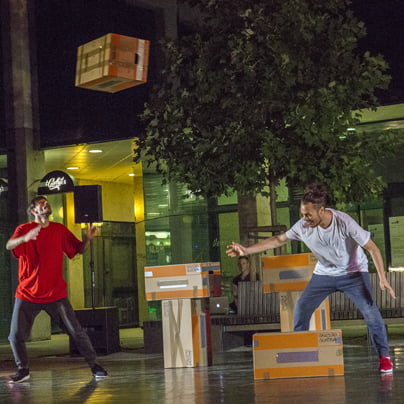 Posebno presenečenje sta pripravila učitelja, plesalca in koreografa, Željko Božić in Miljan Nojić, v osemminutnem odlomku iz predstave Sanjska služba, ki bo premiero uzrla 6. oktobra v Ta hudem abonmaju v Cankarjevem domu Ljubljana, v predstavi kartonske embalaže, pouličnega plesa, hip-hopa, popinga in locinga … Odlomek je stekel v kreaciji tišine in ritma dveh plesnih teles, bil tudi duhovito, inovativno in konceptualno zasnovan, skratka uživali smo in se nasmejali. … Petar Đorčevski in Rita Pollacchi … (foto: Davide Blasini)