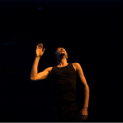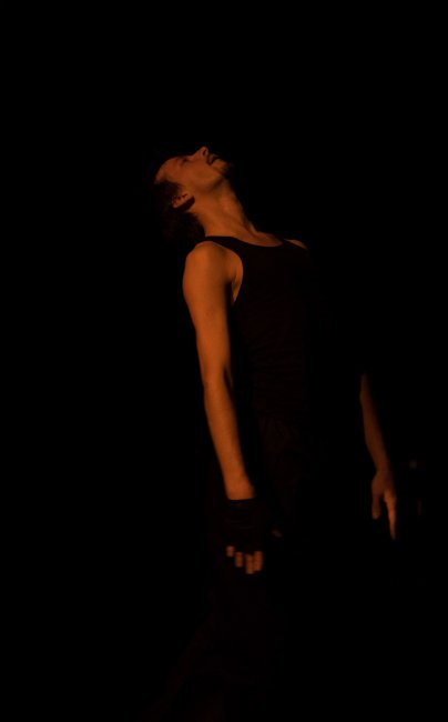 Prva skica se prebira kot pesem nostalgije in spominov, je lirika poeta, zamreženega v preteklosti. S scensko osvetlitvijo raste tudi plesalčeva gibalna intenziteta, ki se dinamično razpreda po ploskvi odra, in takrat je on sam svoj poet, vse dokler se ne odloči – se zaleti in spleza po steni na vrh cevaste konstrukcije dvorane, se tudi sprehodi do drugega konca dvorane ter usidra v kotu. Tu odloži svojo drugo majico, prva je bila črna, v tem trenutku je bela, ob koncu pa znova črna, ko tisto belo spet odloži, sicer ima na sebi dolge, za plesno gibanje udobne hlače (kostumografija Jasna Vastl). Zastavi se vprašanje, zakaj je tam gori, je kar tako nad gledalci, da jih opazuje ali da nabira nove energije, preden se znova napoti v dvorano. To je tudi trenutek, ko se lahko aktivira domišljija vsakega gledalca posebej, ko zavibrirajo možne miselne frekvence in je gledalec živo vpet v scensko dogajanje, če ne drugače pa z obračanjem glave in sledenjem akterjevi poti navzgor ter seveda še navzdol. Solo 2016 (foto: Tamás Tuza)