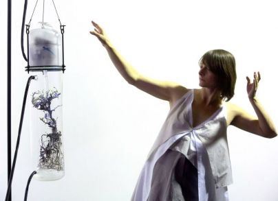 Nekaj pravljičnega je v teh majcenih drevesnih grčah, hkrati tudi nekaj bolečega, ko žična konstrukcija vedno znova opominja na človeško posesivnost in nadvlado; je likovna vizija povezana s sodobnim znanjem in je boleča prispodoba novodobnega statusa narave v rokah človeka ter kapitala. V sožitju življenja in prispodobe naravnega sta umetnici prepletli dinamiko abstraktne (telesne) forme s statiko likovne vizije. Plesno valovanje v izvedbi Nine Fajdige se je dihajoče spletalo s slikovito vizijo, podoživljale so se oblike drevesc in po prostoru je od vhoda do izhoda velo meditativno vzdušje, izpolnjeno z optimizmom umetniškega navdiha. Plesalka je bila v svojem blagoslovljenem stanju bodoče mamice odeta v kostumsko formo moči (kostumografinja Urška Recer), ki je spominjala na skorje in kompaktnost velikih dreves. … (foto: Nada Žgank)