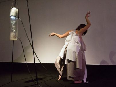 Oktobrske plesne uprizoritve so se kot po tekočem traku vrstile skozi ves mesec in se je s plesom oplemenitilo tudi nekaj drugih zanimivih umetniških oblik. Eno teh je ponudila Galerija Kresija ob avtorski razstavi Ločeno od sveta Urše Vidic Glassworks, ko se je po konceptu avtorice in na razstavi njenih eksponatov zgodil še plesni performans Pendulum / Trilogija Dinamike prostorov-nihanje 2016–2018 plesalke in koreografinje Nine Fajdige ob dramaturgiji Barbare Novaković Kolenc ter na glasbo Davorja Hercega (vokal Mia Marija Herceg). Odprtju razstave 7. oktobra so sledile ponovitve vse do zaključka 26. oktobra. Pendulum pomeni v prevodu nihanje – tako razpoloženja kot izvajanja –, ki se je nazorno spletalo v plesni izvedbi Nine Fajdige ob likovni zasnovi Urše Vidic. V prostoru je bila vidna in slišna baterija (meh) za proizvodnjo megle, povezana z dvema steklenima vitrinama v obliki večjih epruvet, ob mehu je nihalo še polje vidnega ter nevidnega. Ko se jasni meglena notranjost epruvet, postaneta vidna dva očarljiva, filigranska eksponata umetelnih drevesc, izoblikovanih iz finih žičnih prepletov, obdanih z rjavo prevleko v slogu drevesnega lubja, pa še mini zeleni listki krasijo vejice. Nina Fajdiga (foto: Nada Žgank)