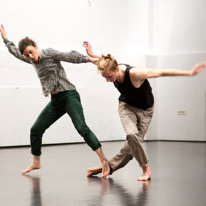 Žigan Krajnčan in Gašper Kunšek, avtorja in izvajalca svojevrstne nonšalantne fantovske gibalne improvizacije z naslovom Ejlijen Ekspress v produkciji Flote – Ljubljana in koprodukciji Plesnega teatra Ljubljana.