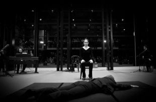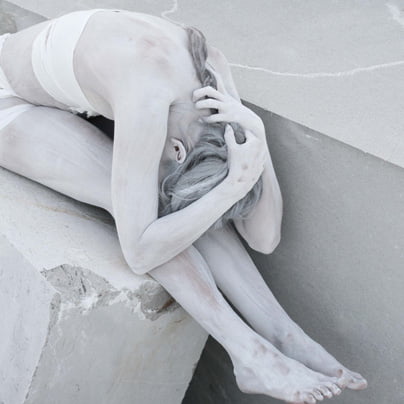 Je eksperiment kontrastiranja med geometričnim in organskim, med živečim in čutečim ter hladnim in mirujočim, predvsem pa med sorodnostjo in tujostjo. Belo pobarvana figura na belem marmorju na prvi pogled sicer spominja na kip, statičen in neločljiv od svojega izvornega materiala, ponekod pa ekspresivnost giba in akumulacija čustva ustvarjata vtis, da se kip kot Pigmalionova Galateja izvija in bori za življenje in organskost, ki sta močnejša, usodnejša in težja od kamnitih blokov. … (foto: Milena Rupar)