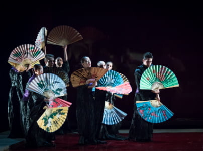 In če gre pri Julki in Janezu za osebni odnos dveh karakterjev, slovenskega zapečkarja Janeza in osebnostne širine Evropejke Julke, je režiser Vinko Möderndorfer v operi Madama Butterfly izpostavil dva različna svetova, ki v danem trenutku trčita med seboj, svet tradicije Japonke Čo-čo-san/Butterfly/Metuljčica ter svet osvajalca in poročnika ameriške mornarice F. B.Pinkertona, ko se v svoji veličini in realnosti izpostavita že v samem začetku koreografske uverture Rosane Hribar, pod glasbenim vodstvom in ob dirigentu Lorisu Voltliniju. Skupina plesalcev ljubljanskega baletnega ansambla – Chie Kato, Marin Ino, Elli Purkunen, Tasja Šarler, Urša Vidmar, Neža Rus, Michele Pellegrini, Filippo Jorio, Filip Viljušič – se v stiliziranih japonskih oblačilih (kostumograf: Alan Hranitelj) najprej posveti spoštljivemu tradicionalnemu (medsebojnemu) poklonu, nato pa se začne ples mehkih prelivajočih se rok in telesnih linij, drobečih korakov ter pospešenih dvigov, ki se pozneje izlije v likovne citate in poslikave velikih pahljač, vse dokler ne vdrejo na sceno pijani ameriški marinci ter se tu in tam zgodi še kak neroden opiti padec. … Madama Butterfly