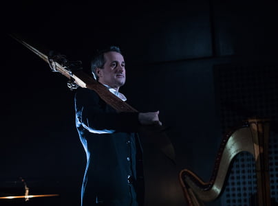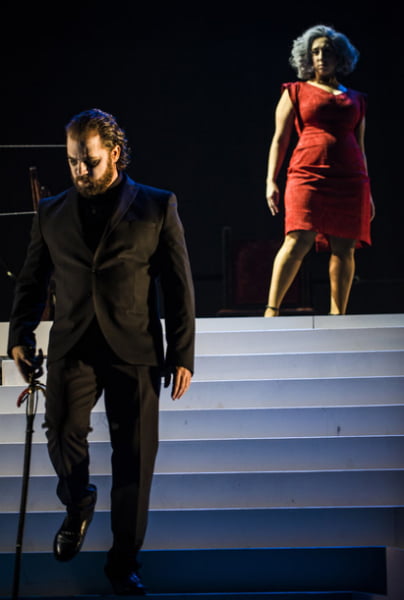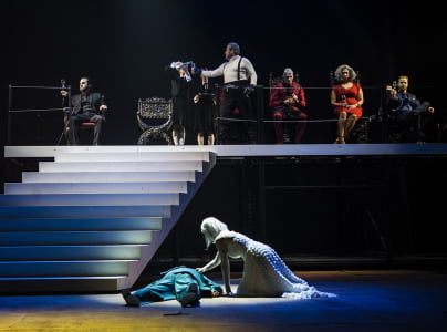 Bogovi opere Rensko zlato pridobijo v režiji Igorja Pissona ter v kostumografiji Sanje Grcić jasno razpoznavna človeška obličja, ki se tuzemeljsko še potencirajo v scenski postavitvi ter v oblikovanju luči Petre Veber; v sceni visokega stopnišča, ko se tisti zgoraj, vsemogočni bogovi, kar lahkotno spustijo tja dol, ko gre za ukradeno rensko zlato in zlovešči prstan, ki daje posebne moči ter pogublja osebnost (kot v filmski zgodbi Gospodar prstana). … (foto: Matija Lukič)
