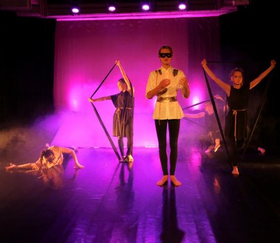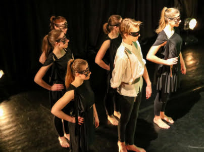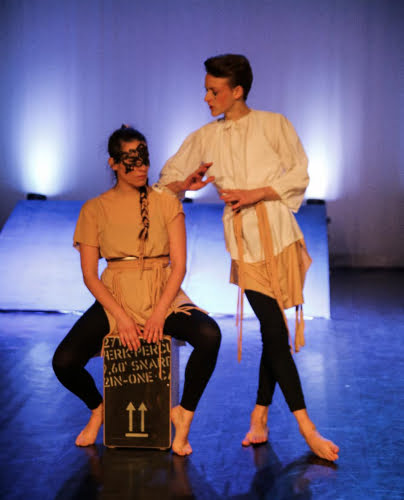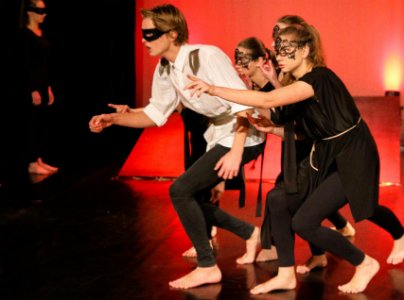 Scenarij se je začel že pri samem vhodu obiskovalcev, ko so jim bile dodeljene črne maske in so tako hočeš nočeš postali tudi del uprizoritve.  V tej plesno-glasbeni predstavi se dramska oblika smiselno prepleta s koreografsko postavitvijo, gib z govorjeno besedo in gledališka igra s plesno formo, kjer poleg plesalk nastopajo še junaki pripovedi: Nejc Drev, prefinjeni princ Prospero, prinčevske, kar prirojene baletne drže; poskočni in igrivi dvorni norček I Gašper Marčič, ki je svoji vlogi vdihnil mladostno svežino in kar prijetno igralsko noto; dvorni norček II  je izkušena plesalka določene plesne generacije PFC Paulina Veronek, ki pa je še vedno aktivna na plesnih vajah, tokrat v damski skupini Gee Erjavec; njena norčava vloga je bila dobro zaokrožena, tudi zaplesana v duetu z ritmičnimi tolkali in s svojim mladostnim norčkom; oba norčka sta se predstavila kot glasnika prihajajočih dogodkov, kot razgibana pripovedovalca dramske zgodbe. Koreografija je dramsko zasnovana, tudi poslikana z likovnimi in situacijskimi gibalnimi utrinki, kar kaže na dovolj poglobljeno razmišljanje o dramski zasnovi in njeni uprizoritvi v jeziku plesne abstrakcije ter gibalne pripovedi, kar dodatno niansira in potencira tudi avtorska glasba.