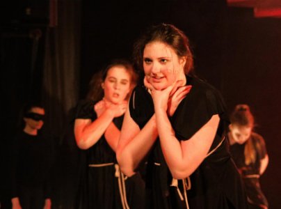 Koreografijo za polurno plesno predstavo Maska rdeče smrti sta prispevali Sandra Jazbec, ki je pripravila gimnazijske dijakinje, in Breda Stepan, ki je vodila učenke osnovne šole. Sandra Jazbec izhaja iz učnih baletnih ter modernih plesnih programov celjskega Harlekina, svoje plesno šolanje je nadaljevala na SVŠGL umetniški gimnaziji, smer sodobni ples, deluje kot plesna pedagoginja, saj redno poučuje ter vodi plesne programe tako pri Harlekinu, na GCC in še kje ter se še naprej plesno izobražuje. V predstavi so nastopile njene gimnazijske plesalke: Katjuša Tratar, Jona Veber, Ajda Kostevec, Lana Leskovšek, Iva Planko, Iva Cimperman Fric, Amanda  Černoša in Urška Režen; iz osnovne šole pa so plesale: Pia Jelena Džakulin, Nija Blažan, Neža Končan in Ula Dobovičnik. Posebej so v koreografski zasnovi prišle do izraza že bolj ozaveščene plesalke, npr. v triu, ki zlovešče napoveduje strahove: Ajda Kostavec, Katjuša Tratar in Jona Veber, ko so ubrano, tudi dovolj izrazno gnetle ter izražale svoja notranja stanja. Joni Veber in njeni plesni ubranosti se potem sledi še v duetu sodobno plesnih povezav ter akrobatike s Katjušo Tratar, v prizoru borbe prebivalk izven dvornega obzidja, ko skušata prodreti skozi premikajočo se, vendar strnjeno vrsto grajskih čuvajev, plesalcev. Na zaključnem dvornem plesu, ki barva slog dvornih plesov, pa po svoji estetski plesni drži izstopa tudi Pia Jelena Džakulin. Ajda, Jona ter Pia, tudi članice PFC, so še dodatno povezane z ustvarjalnim gibom. V predstavi nastopa še štirinajstčlanski zbor GCC, ki je deloval pod umetniškim vodstvom Gregorja  Deleje.