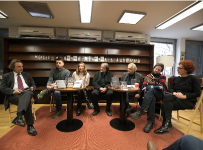 Medved je z naravnost otroškim čudenjem sledil vzgibom živali in jih poskušal zajeti v mrežo verzov, ki kot celota učinkuje filigransko razkošno, v posameznih pesmih pa asketsko precizno (posamezne pesmi učinkujejo skoraj kot haiku), na tak način, da njegova govorica ni samo človeška, ampak vznika iz prostora srečanja človeka in živali. V tej knjigi je neka sorodnost s tistim, kar si je želel ekspresionistični slikar Franz Marc: da bi naslikal svet, kakor ga vidi žival. Dr. Igor Saksida in Rok Terkaj, zadaj dr. Miklavž Komelj (foto: Mediaspeed)