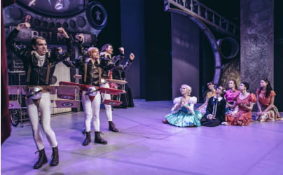 No, del muzikala je tudi ples, in tokrat je imel kar svoj prostor, za več bi moral biti še večji oder, kot pravijo, je ta že v načrtu gledališča. Koreograf Miha Krušič je bil tisti, ki je igro igralcev dobro in pristno razgibal, tudi razvejal po prostoru, kolikor se je pač dalo. Da imajo vsi igralci po vrsti tudi dovolj kondicije in razgibana telesa, je bilo opaziti v njihovih izvedbah. Plesali med igralci in bili tudi vidni v skupinskih scenah, še posebej v solističnih izvedbah ali v trojkah in duetih so: Matevž Česen / Tian Čehić, Tim Klemenčič / Matej Bedič, Anja Möderndorfer / Petra Rvabar, Tadej Premk / Jan Marolt, Karin Putrih / Tjaša Resnik, Katja Škofic / Nika Horvat. Matevž, Tadej in Tim so preskakovali v višavah in se razkazovali v ‘mačo močeh’, medtem ko so mladenke Anja, Karin in Katja enkrat osvajale ter naskakovale lepega Benedikta, ki jih je vešče lovil in obdržal v utesnjenih pozah, drugič pa bile poskočne nune. Vsi trije pari so zaplesali še strastni tango kar v hollywoodskem slogu, ko so za svoj ples pridobili prazen podij, da so se lahko razgalili ter zablesteli v duetih in plesnem siju muzikala. …