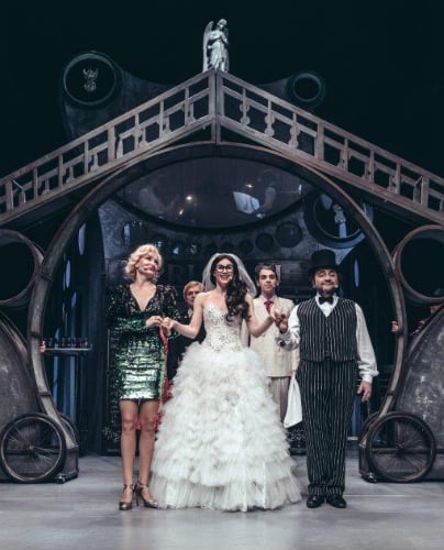 Prvi čudež se zgodi že pred zaveso, ko se Maša v svoji ‘oštirski’ opravi samo obrne in pred gledalci že stoji v gala večerni modrini, posuti z zvezdami, je prava zvezda, ki sprejema in predstavlja prihajajoče prebivalce. Prvi stopi pred njo vinjeni župnik (Uroš Smolej), ki že na poti k Maši poskrbi, da je čim več Boga v njem: da je vino resnica in je resnica Bog, vino pa še Kristusova kri, torej če več vina spiješ, več Boga zaužiješ, kar se razodene v songu Bog mi je v krvi. …