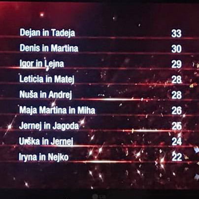 Najbolj neprimerno glasbeno podlago sta imela po mojem mnenju Maja Martina in Miha za svojo sambo, ki to ni bila. Ed Sheeran je bil uporabljen pri obeh rumbah in obe sta bili lepi, všeč pa mi je bil tudi moderni cha cha cha za Dejana in Tadejo. Lestvica pete oddaje (foto: POP TV)