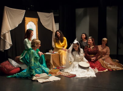 Na odprtem odru je postavljen in osvetljen intimni kotiček sobe, prekrite s preprogami in blazinami, ki spominjajo na domači milje bližnjega vzhoda, tu sta še ogledalo in mizica. Ko ena za drugo vstopijo ženske v sobo, prinesejo še obvezni bakreni podstavek s skodelicami za kavo.  Prišle so na ženski večer, na predvečer poročnega dne, ko se ena med njimi poroči, da bi se posvečale prijateljevanju, klepetu, spominom in zgodbam, odete v elegantna svečana ženska oblačila v sedmih barvnih odtenkih, ko jim tu in tam lase krasijo mali klobučki, kak šal in pajčolan. Obleke so si dale ukrojiti in sešiti po starih poslikavah in filmskih predlogah, kjer so dobile tudi inspiracijo za izbrana ženska dvorna oblačila Perzije, ta zahtevni projekt pa uresničile s podporo Javnega sklada RS za kulturne dejavnosti in Mestne občine Ljubljana.