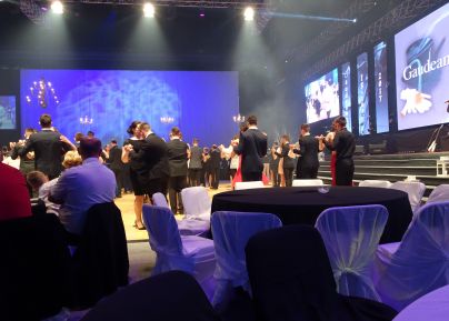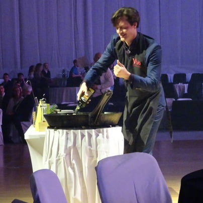 Večer je bil – na kratko – popoln odklop, hkrati pa ponujal raznoliko, pestro, zabavno ponudbo. Dogodek je s svojim plesnim šarmom, humorjem, igrivostjo povezoval igralec in voditelj Domen Valič. Ta je bil tako rekoč zvezda večera, saj so v času odmora mlada dekleta, ki postajajo odrasle ženske, nenehno hodila do njega, da z njim spregovorijo nekaj besed in – seveda – da naredijo vizualni fenomen trenutnega časa, tj. selfi. Ob zatemnitvi dvorane je goste pozdravil in odprl večer, sledila je četvorka, imenovana tudi kraljica družabnih plesov, in plesni venček. S simbolnimi, znanimi besedami je dijake skozi ples vodila in z njimi besedno zaplesala plesna mojstrica Janja Pušl. "Ples spremlja človeka skozi vse življenje," je povedala zbranim. V plesnemu venčku pa so spretno, natančno zaplesali pet plesov, in sicer popularno bachato, angleški valček, modern techno swing, čačača, končali pa z drznim tangom. Sledil je ples s profesorji in ples maturantov s starši, kar je bilo za marsikoga poseben trenutek. … v kuharskem elementu …