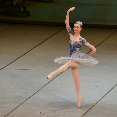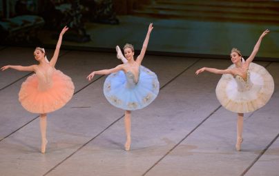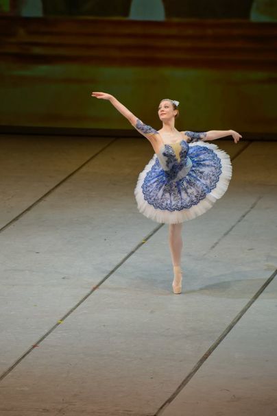 Gracilna princeska Aurora, pravljična Trnuljčica, pa zapleše v pozdrav svoj ples visokih razpotegnjenih linij na vrhovih prstov. Mogočni diadem krasi njeno glavo, ko v vilinski modrini zavrti baletne vrtince ter s svojimi vilami spleta svet mladostnih iluzij. Liza Podjavoršek (foto: Mediaspeed)