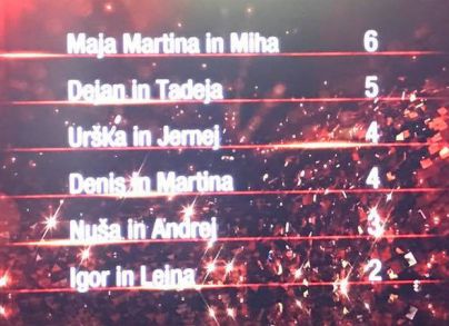 Ker nova pravila narekujejo. da se dva para z dna lestvice znova pomerita v t. i. plesnem dvoboju, smo Denisa in Martino ter Igorja in Lejno videli še enkrat, sodniki pa so se odločili poslati domov Igorja in Lejno. Zanimivo je bilo videti, da sta oba para drugič odplesala bolje kot prvič: Igor z boljšo držo in Denis bolj sproščeno. Tabela po odločitvi sodnikov (foto: POP TV)