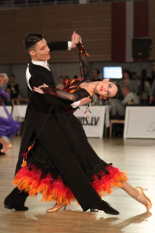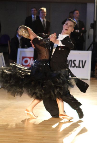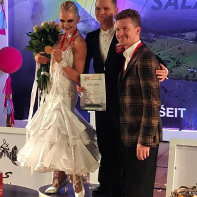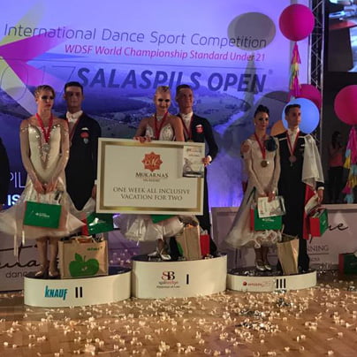 Zmaga v kategoriji standardnih plesov za starostno skupino plesalcev do 21 let je ostala na domačih tleh. V Salaspilsu, osemnajst kilometrov od Rige, glavnega mesta Latvije, sta se varovanca ekipe iz plesnega kluba Diamant, ki jo sestavljajo Alekseja Galčuna, Tatjane Lahvinovič Galčun in Zorana Plohla, Denis Gudovski in Megija Dana Morite okitila z naslovom najboljšega para na svetu v tej kategoriji. Denis Gudovski in Megija Dana Morite na stopničkah najboljšega para na svetu v kategoriji do 21 let v standardu. (foto: FB)