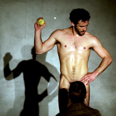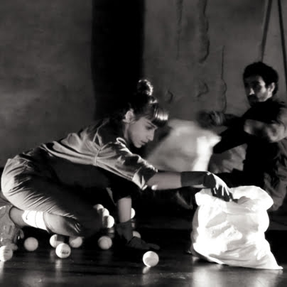 Ves čas sta eden ob drugem, pa vendar vsak na svoji strani, ali v paralelnem mimohodu, sta v komunikaciji, ampak brez besed, saj te letijo z glasbenimi valovi, blizu sta si, vendar brez dotika. Njuna pogleda se ne srečata, drsita mimo, tudi če se objameta, se roke stegujejo stran od telesa. Vsak zase izoblikujeta svoj solistični okvir, kot bi hotela prodreti eden v drugega. Sledi drobljenje korakov, stik z videom, na trenutek eden obstane kot kip z žogico v roki: kam jo vrže, komu odbije? Njeno telo se trese in obleži. Ona ga začne počasi slačiti, sloj za slojem luščiti (obleko), vse dokler nag ne obstoji pred njo. Potem ga obmetava z žogicami, ki se odbijajo na vse strani. Je jezna, mogoče ga drami, je  nesporazum, bolečina? Razideta se, on pa še vedno v fizičnem zagonu, čeprav razgaljen, na tleh pa razmetane vse tiste rumene žogice, ki čakajo novo povezavo, nov razmislek, novi izpis.
