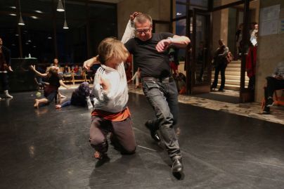 Ta se je najprej razlivala po sončni Slovenski (plesni) ulici zadnjega festivalskega dne uro pred dvanajsto, ko je skupina poplesavala in se premetavala po asfaltni površini ter prijetno vznemirila mestno središče, na koncu so se vsi skupaj dobesedno ‘natlačili’ v osebni avto in se pod budnim očesom redarstva še malo po filmsko zapeljali naokrog, tudi srečno vrnili na izhodišče dogodka. Drugič so zaplesali še v avli Gledališča Grad tik pred začetkom zadnje predstave, ko je Gašper v njihovo plesno improvizacijo pogumno potegnil še Fariča, ki je dogajanje kar dinamično razpotegnil po prostoru. … Lia Ujčič: Ko ob mojih nogah drema tiger …