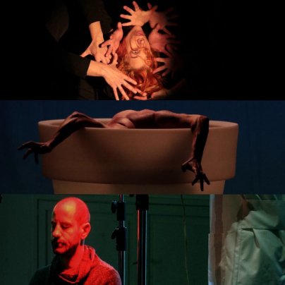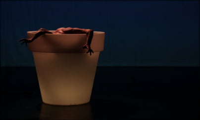 V avtorskem solu Rdeča – Sled se tudi plesalec Matjaž odpira sferam gibalnega besednjaka, ko razpira svojo telesno ujetost ter razgali lastno telo na obodu velikega glinenega lonca; mar ni tudi cvetlica življenje, ki buri občutke, ki se lahko barvajo, vonjajo in jih sinesteti tudi slišijo. Sinestezija (foto: Sunčan Stone)