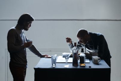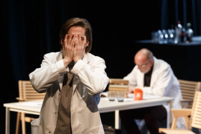 Na oder stopi najprej avtor te sklepne odrske kreacije Sinestezija-Opus!, plesalec Matjaž, ki v plesni eleganci in gibalnih presežkih petdesetletnika portretira na sceni popotnika ter umetnika, ki v svojem plesnem krogotoku zaobjame celotno odrsko površino, tudi razpira elegantne vzgibe rok, te čutne in delovne telesne podaljške, ki tečejo in se prepletajo, kot bi vizualizirale nevidno razpravo. Na sceni se uzre več stolov, v ospredju pa še trije udobni stoli, ki jih zasedajo trije igralci, akterji in znanstveniki v predstavi; Klemen Janežič (mladi znanstvenik), Iztok Drabik Jug (sinestet, tudi prijatelj Michael) ter Tomaž Gubenšek (starejši kolega znanstvenik), ki polnokrvno zarežejo v bistvo problema, ko mladi znanstvenik spodbuja svojega prijatelja sinesteta, naj sodeluje pri njegovih znanstvenih poizkusih odkrivanja ter zaznav možganskih (sinestetičnih) odzivov, ki ga skoraj stanejo življenja in bi ga tudi, če ne bi bil prisoten izkušeni starejši kolega, profesor, ki mlademu znanstveniku skuša razjasniti obzorja človeške etike. Občudovanja vredno je, kako se je igralec Janežič posvetil suhoparni znanstveni razpravi, tudi jo pristno vtisnil v sceno odra, ali pa nerazumljivi stoični mir, s katerim se Jug v vlogi Michaela prepušča eksperimentom znanstvenika in celo prijatelja, tudi Gubenškova prispodoba življenjske modrosti ter prefinjenega poučevanja, ko se izkušeni starejši znanstvenik ne meri več z mnenjem mlajšega kolega, ampak ga predvsem skuša usmeriti k obzorjem človečnosti. Sinestezija (foto: Sunčan Stone)