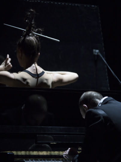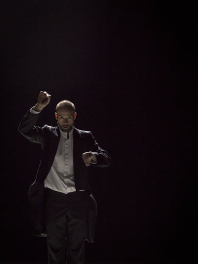 Korakoma v sceno velikega praznega koncertnega odra vstopi najprej on, Maestro, primerno odet s koncertno eleganco, ko pridejo do izraza  njegovi mali vzgibi, filigranske strukture ročnih oblik, nato se že zasledi premikajoče se gibanje dirigenta, vpetega v lastni ustvarjalni svet. Kmalu se mu pridruži njegova Muza v belem kostumu, spredaj z orisom violinskega ključa, zadaj na hrbtu pa basovski ključ, ki ob svojem črnem zaključku kar zastavi vprašanje o repnem nastavku. Muza je vitka, gibčna, njun odnos na trenutke proseč, tudi ljubeč in hvaležen, ki ga tako ali drugače realizirata ob svojih srečanjih, rekla bi, da je Muza predvsem njegova iščoča ustvarjalna Nota, vrhunec, ki ga skuša uloviti, tudi izpisati v notnem sistemu na razprostrti projekciji po stranicah odra. ki se ji sledi kot koncertni dekoraciji. Scena Marka Japlja je estetsko izčiščena, prepuščena tonom glasbe in plesu, tudi omenjenemu notnemu scenskemu izpisu, ko pa nastopi orkester plesalcev in se zalesketajo luči, so po sredi bleščeče scene postavljeni koncertni stoli rezervirani za baletno koncentriranje, na čelu teh pa, on, Maestro. Sugestivno se sledi skupinski sceni (orkestralnih) gibalnih izrisov, ki se ne spuščajo v preprosto kopiranje instrumentalne igre, ampak domiselno v abstraktnih formah ter plesnih izzivih dinamično zarišejo v koncertno atmosfero, v prispodobo virtuozne igre ter vzgibov glasbenikov, ko se zaiskri še kaka osebna izpoved ali sledi duet, izstopi manjša skupina, prav tako ne manjka osmišljenih ter humorno zasnovanih trenutkov.