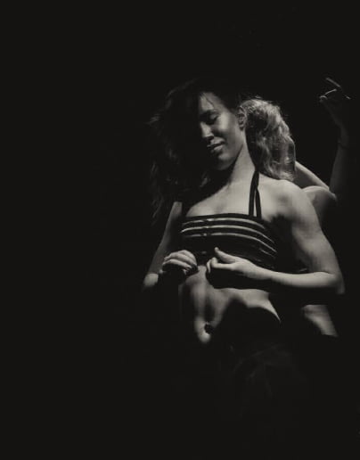 V skrivnostni svetlobni animaciji (luči Janko Oven) je bila na sredi dvorane vidna lesketajoča se vzpetina, neke vrste skala, domnevno tik pod površjem morske gladine (scenska postavitev: Liza Šimenc, Urša Rupnik, Aljaž Verdev, Tatiana Kocmur). Na morske globine spominjajo tudi prodirajoči zvoki (avtorska glasba Blaž Pavlica, glas Tea Vidmar), ki počasi in vztrajno prodirajo skozi neznano vodno prostornino, se odbijajo in šumijo, kot bi udarjali valovi ob pečine, tudi z bobnenjem napovedujejo neznane potresne moči nevidnih globin. Sugestivna tišina in zvoki prispevajo k trenutkom meditativne tihote v dvorani, nato pa se začne modrikasta masa vzdigovati, prepogibati ter spreminjati svojo obliko, vse dokler se iz nje ne izvijeta dve ženski podobi, zlepljeni s hrbti, na spodnjem delu njunih obrazov pa je vidna črna fantazijska maska (je dihalni pripomoček ali možna organska zaščita pred jezičnim ženskim organom?), težko se opredeli skrivni pomen maske, ki pa je v tej mitološki obliki in kostumski opravi kar atraktivni likovni pripomoček (maske Andrej Erjavec). Ko se ženski obličji odpirata v svoji gibalni lepoti in vzvalovita v liričnem potencialu svojih rok, maski tudi odvržeta, torej svobodno zadihata s polnimi pljuči, kar napovedujejo tudi njuni prebujajoči se vzgibi ter gibalno vzvalovanje na pol razgaljenega toraksa. Njuni pogledi, rahli premiki ter nihajoči zamahi teles tečejo upočasnjeno, ob tem tudi rahlo vznemirljivo.