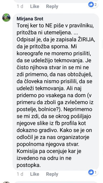 Mirjana Šrot pa pravi: "Koreografov ne moremo prisiliti, da se udeležijo tekmovanja. Je to isto njihova stvar…” Da, draga Mirjana, samo na vsakem ‘strokovno nespornem’ tekmovanju takšen koreograf pač ne bi mogel tekmovati oziroma bi bila njegova koreografija pozneje dokvalificirana. Organizator je vedel, da koreograf ni prisoten na tekmovanju in ni glede tega storil ničesar, ampak je zadevo hotel speljati kar tako. Seveda to ni stvar komisije! Še enkrat – pritožujem se nad organizacijo tekmovanja in ne nad žirijo ali nad samim koreografom, njihovo delo cenim in spoštujem.