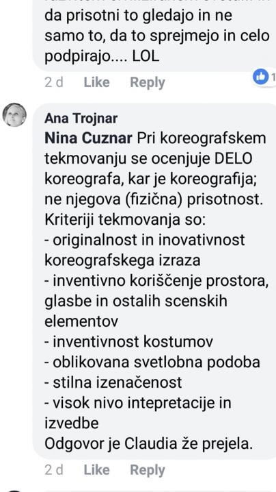 Ana Trojnar odgovarja na mojo izjavo o nepravilnostih, ki so se dogajale na koreografskem tekmovanju v sklopu tekmovanja, ki se je odvijalo v SNG Maribor 20. – 23. 6. 2018. Citiram: ”Claudia Sovre navaja zavajajoče podatke.” Jaz pa odgovarjam: Za informacijo o nagradi (zavajajoč podatek) sem izvedela od drugih udeleženih na koncertu in je bila samo delno nepravilna. Napaka pa je bila samo v imenu Ana Trojnar in 6. mesto.