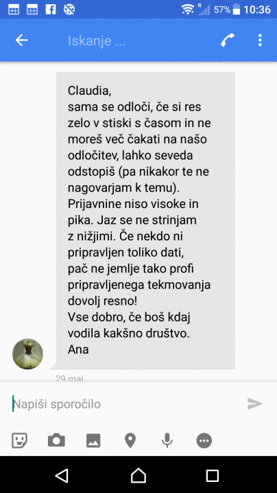 Našla sem tudi odgovor Ane Trojnar (ki ga ona ne najde), kjer sem jo vprašala, do kdaj mislijo razmišljati, ali bodo sploh podaljšali rok prijav za Tutu ali ne, saj so bili do tekmovanja le štirje tedni, in kjer sem ji rekla, da se mi zdi prijavnina previsoka, saj je bila na 1. koreografsken tekmovanju pred  tremi leti 60 ali 70 evrov (natanko se ne spomnim), zdaj pa je bila kar 130 evrov. O njenem odgovoru glede višine prijavnine za ‘tako profi pripravljeno tekmovanje’ lahko presodite sami.
