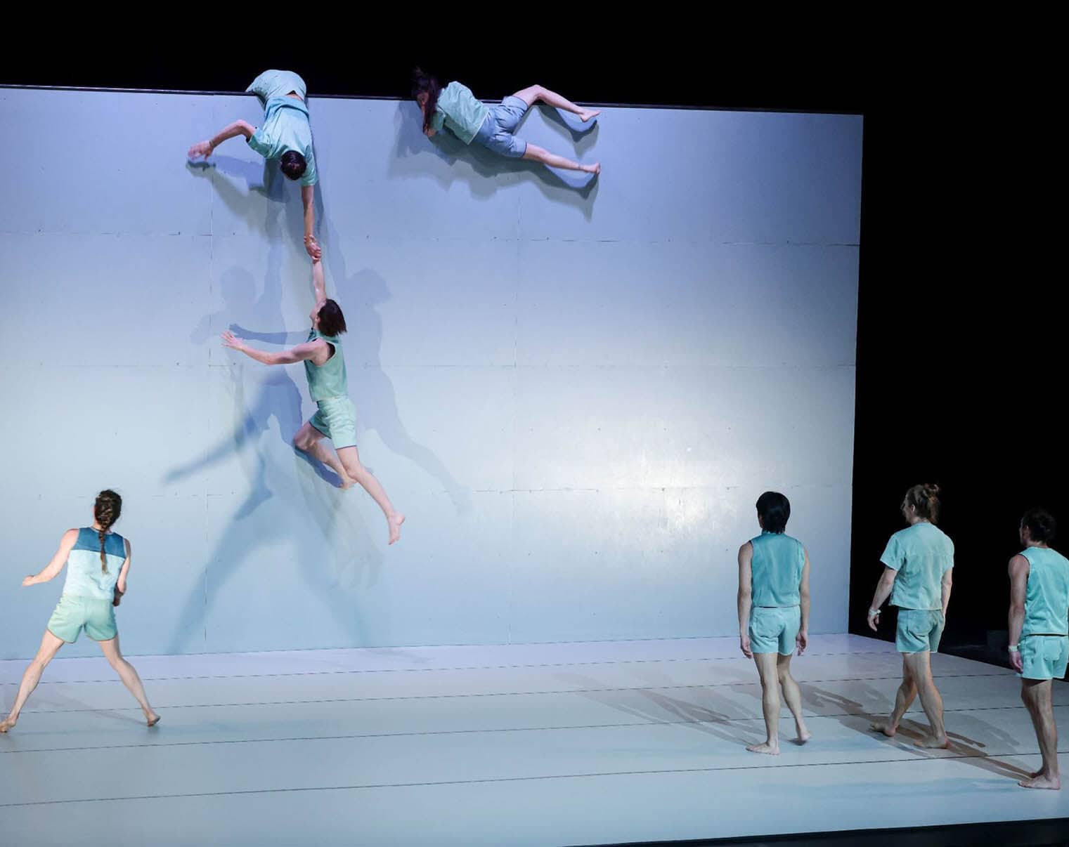 Premiera je 12. decembra stekla na odru SMEL, Elektro Ljubljana, ko se v poltemi iskrijo bele vrvi, v ozadju pa se počasi razpira zavesa, ki odpira slikovito sceno neštetih temnih sakojev. Viseči sakoji v ozadju dajejo videz minule delovne vneme moške osebe, tudi tu je zaznana belina visečih vrvi, ko na eni prav ob vrhu leži črna silhueta. Zgodi se tudi tihi skrivnostni trenutek, zaznan v nizu kriminalk, ko izza zavese v prostor skrivoma vstopata dva moška v črnem in velikih korakov, zasidrata pa se na levem stranskem delu dvorane ob klavirju, medtem ko za seboj puščata sled belih vrvi, ki zaznamujejo široko ravno pot. Po tej poti se v prostor napoti mali človek, bosonog ter odet v preprosto športno opravo. Njegovi gibi so upočasnjeni, tudi minimalistični, ko se v svojem pravokotnem bivaku, ograjenem z belo vrvjo, namesti in začne svoj vsakdanji ritual, ki ga očitno ne zadovolji. Tako se znova ter znova zaluča v višave mnogih visečih belih vrvi ter znova in znova trdno in odmevno pada na tla, vse dokler na koncu nepremično ne obleži.