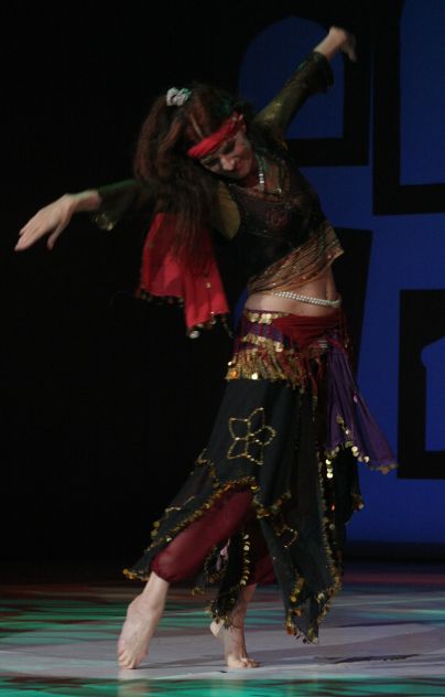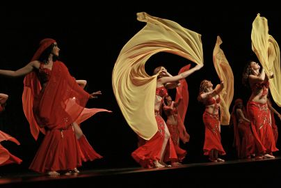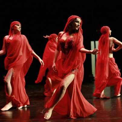 Na ulicah so poleg ciganov predvsem v arabskem svetu nastopale tudi družine glasbenikov in plesalcev, seveda moških. Tako so tudi moški plesali trebušne plese ob zvokih glasbenih ritmov. Moški trebušni ples je enako kot ženski bogat z gibi medenice in bokov, eleganten v pokončni drži in v gibanju rok. Njihov kostum gotovo ni tako razkošen niti bleščeč, nekateri imajo okoli bokov prepleteno zavozlano debelejšo vrv, tako da se v ritmu glasbe in ob poskakovanju vozlov še posebej poudarijo bočni gibi. V tridesetih letih 20. stoletja, ko se je v Evropi širil duh nemškega plesnega ekspresionizma, je sirijska plesalka orientalskega plesa Madia Masabin postavila prvi kabaret s trebušnim plesom v Kairu in od takrat dalje ta plesna zvrst posega po odrskih deskah. Njena zasluga je, da plesalke ne plešejo več na mestu, ampak se bolj svobodno gibajo po prostoru. Skozi novodobni čas pa so se stili in raznolikosti afro-arabskih trebušnih plesnih elementov mešali in pomešali, tako se danes povezujejo tudi z drugimi plesnimi stili ter elementi, kar so tri koreografinje tega večera s svojimi dvanajstimi plesalkami in enim plesalcem tudi stilno nazorno predstavile v veliki dvorani Centra za kulturo Španski borci. … miline ženskega gibanja in poživljajočih ritmov.